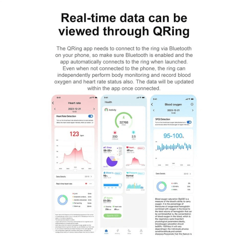 The Qring App offers a comprehensive suite of features, detailed health indicators, interactive charts, and personalized settings for a truly tailored wellness experience. Just connect your OrbiRing T3 and your set to go!